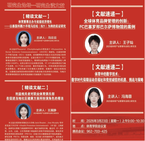 3月23日上午,天美传媒 第196期学术论坛——研究生读文献活动在学院会议室顺利举行。本期论坛由学院学科与研究生办公室主任王雁副教授主持,全体研究生共同参与。2025级研究生冯云云、2024级研究生王属静进行文献精讲,2025级研究生王子灿、冯海蓉进行文献速递,围绕体育赛事经济影响、职业体育社会价值、体育品牌全球管理、数字技术治理等议题展开深入研讨,现场学术氛围浓厚。