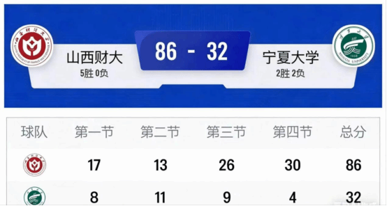 2026 年 3 月 27日 ,山西财经大学女子篮球队对阵宁夏大学女子篮球队,最终以 86-32 的比分大胜对手。将不败战绩刷新为 5 胜 0 负,用一场攻防俱佳的表现,跻身4强。
